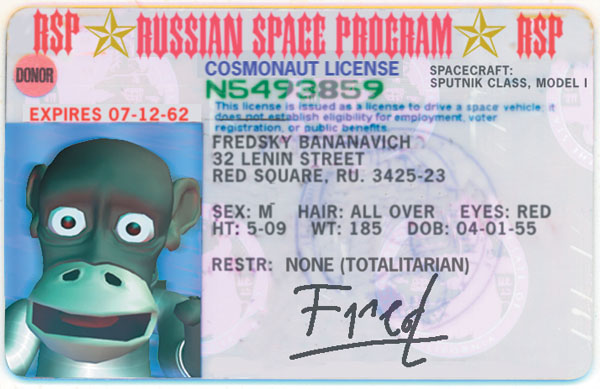 Fred's cosmonaut license! My concept, photo and license but Marilyn Novell integrated